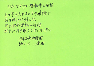 | メッセージ | こんにちは。横浜で活動しておりますバトンチーム、ヨコハマリトルメジャレッツです。先日は関東大会、全国大会の会場までの送迎をしていただきありがとうございました。 一昨年前からお世話になっているシティアクセスさんはドライバーさんもすっかり顔なじみ。降車の際にはいつも「頑張ってね。」と笑顔で送り出してくれます。 これからも支えてくださる全ての皆様に感謝の気持ちを忘れず日々精進してまいります。今後ともよろしくお願い申し上げます。寒い日が続きますがどうかご自愛くださいませ。 N様